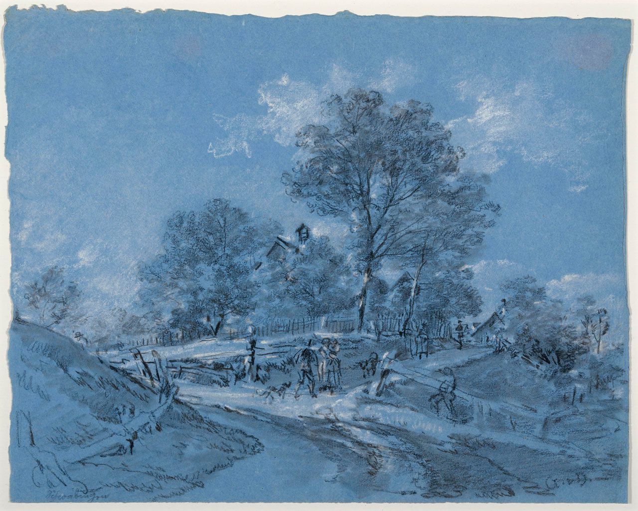Black and white chalks on electric blue laid paper