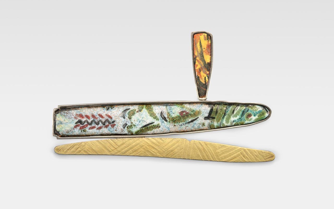 Aioula #15 of 1988 is part of a series of work in which richly colored enamels applied in a vibrant, painterly manner are framed within attenuated organic shapes juxtaposed in a dynamic counterpoint with gracefully arcing forms in silver and gold. The name of the series, “Aioula” comes from a word meaning “garden” in the southern Italian dialect the artist’s grandmother spoke as a child. As in Bennett’s earlier Calypsos and Deerrun series, the Aioulas possess an elegant linearity and a gracefully flowing rhythm.