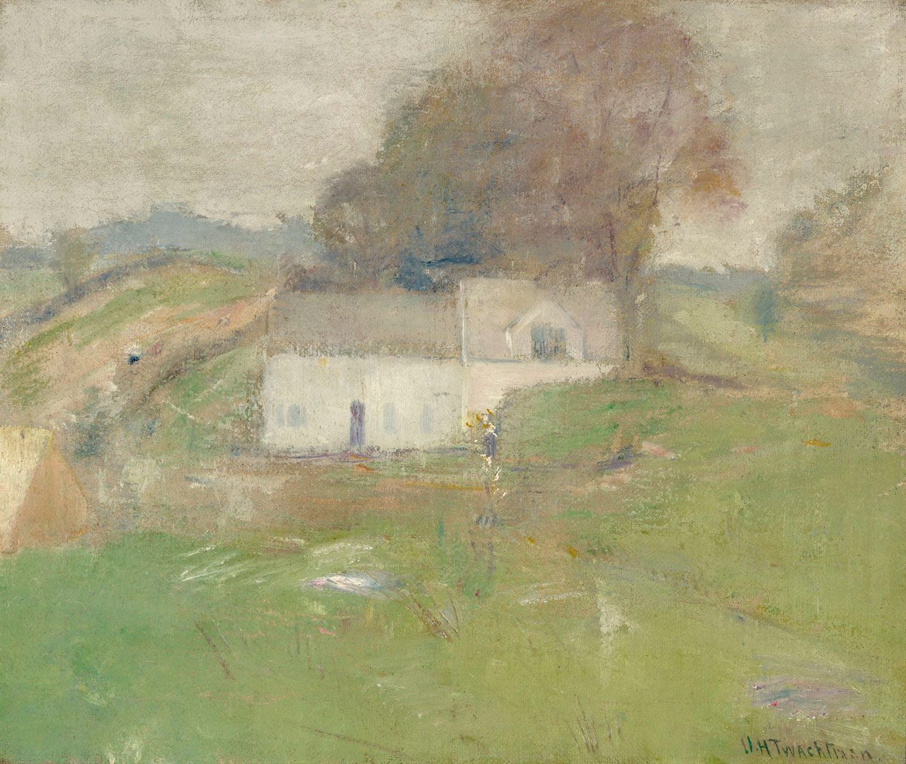 User Text: This painting depicts the north façade of John Twachtman’s house on Round Hill Road in Greenwich, Connecticut, shortly before the artist renovated it. He portrayed his seventeen-acre property and its architecture often, depicting not only his house and barn, but Horseneck Brook and its falls, and trees in spring and winter. Twachtman originally intended to build a larger house on top of the hill, but found that this house was perfectly situated and decided instead to renovate the existing structure and bring it into harmony with the landscape.1