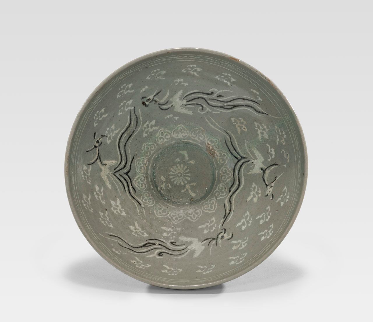 Title: "Bowl" changed to "Bowl with Phoenixes and Clouds Design", Description: changed to "Stoneware bowl with white and black slip inlay (sanggam) design of flying phoenixes against clouds in the interior, chrysanthemum roundels and leaf scrolls in the exterior; celadon glaze". Updated by A. Chau, 2/25/2023.Note