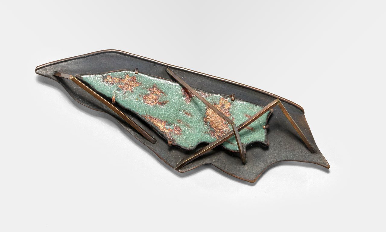 Copper, brass, liquid enamel, and sifted enamel