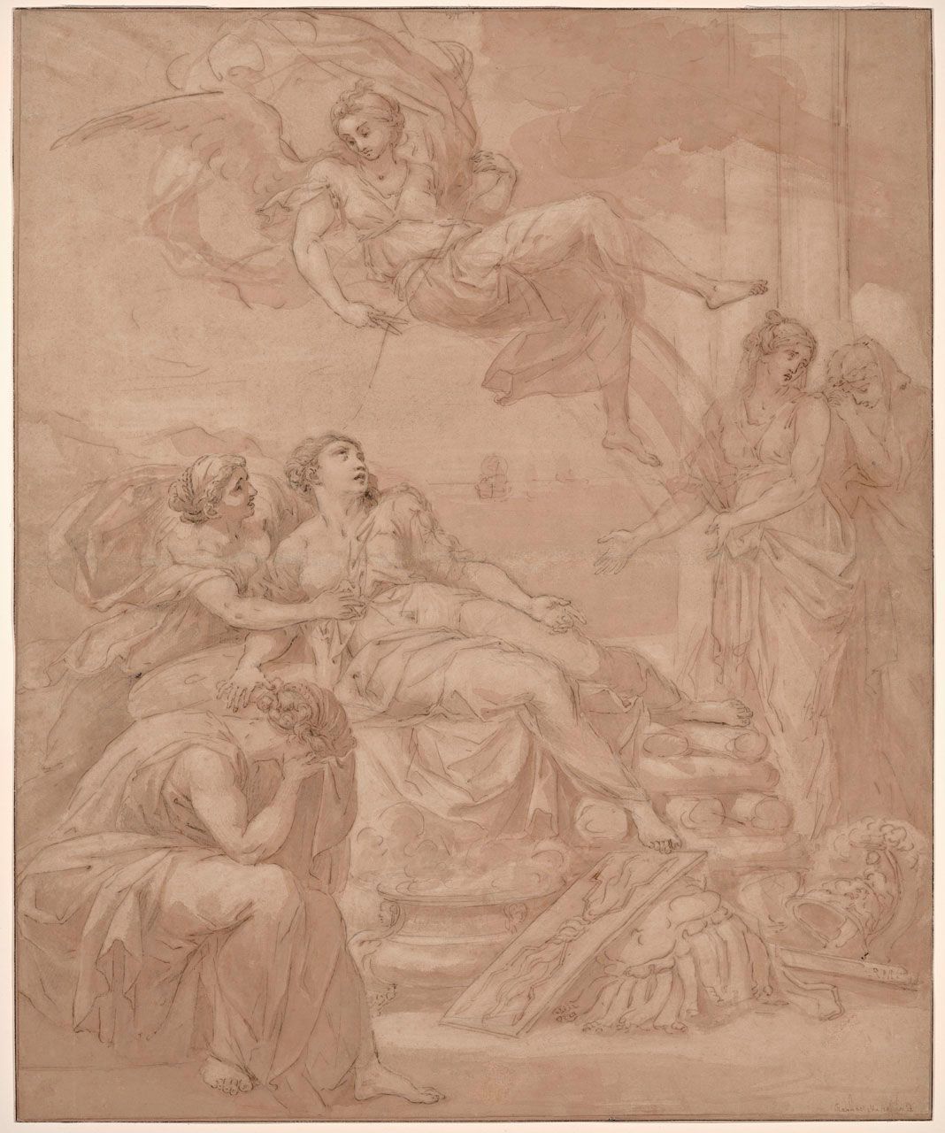 Pen with brown and dark brown inks with brush and brown washes over black chalk