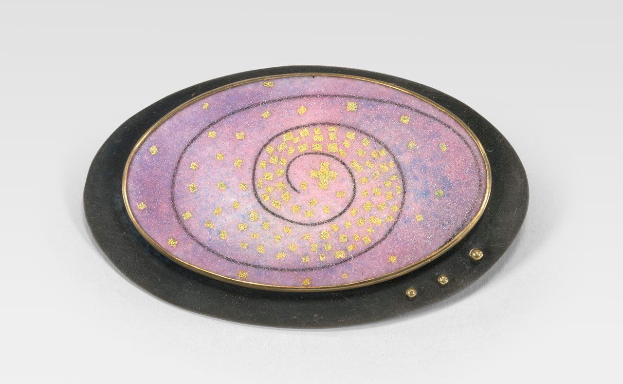 The Descansos brooch was created at the same time period as the Proust Reliquary Box and is also inspired by roadside memorials. The spiral in the enamel is made by embedding fine iron wire into the enamel and firing. I am really excited about this technique and the graphic quality it creates. This brooch also has pieces of 24k gold foil fired in and a final coat of enamel that has been sugar fired, creating the beautiful textured surface. In this piece the wire represents a fine imaginary thread, that anchors us to the earth.