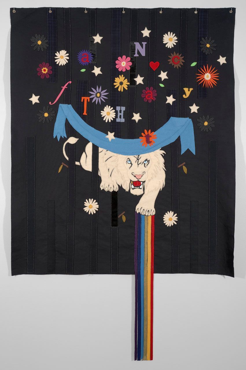 Wood, vinyl, and cotton on unstretched canvas
