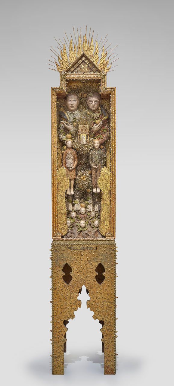 These images integrate ceramic, which is the primary medium, with wood, fresh water pearls, semi-precious stones, gold leaf and oil paint. They are made complete with secret compartments which serve as hiding places for multiple and often times personal meanings. My recent work is based on narratives drawn from personal and historical events that are overlapped with subconscious images. The figures are like actors on a stage, enigmatic yet tense while being enveloped or encrusted within layers of overgrowth concealing a world within.