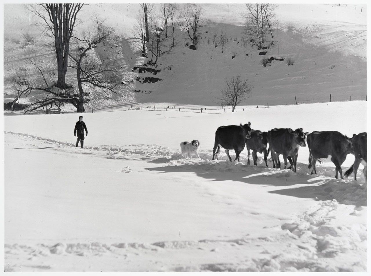 Farmer's son and collie dog driving the cows back to the barn after watering them at the brook, all other sources of water supply were frozen for two months during very sever winter. Clinton Gilbert's farm. Woodstock, VermontEntry/Object ID