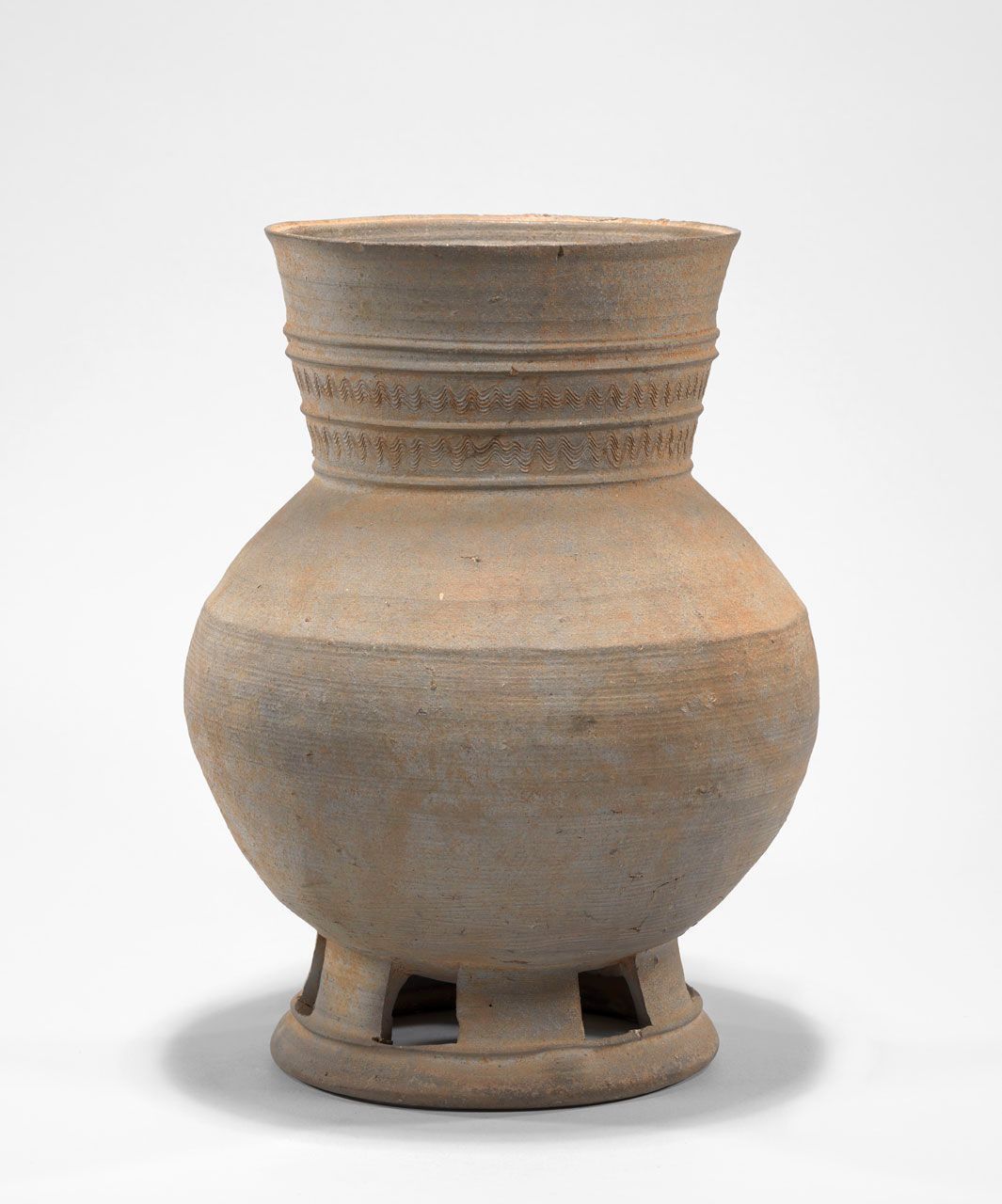 Description: added "Stoneware jar with a tall neck with two rows of incised waves, a bulbous body on a perforated, ringed foot". Updated by A. Chau, 3/1/2023.Note