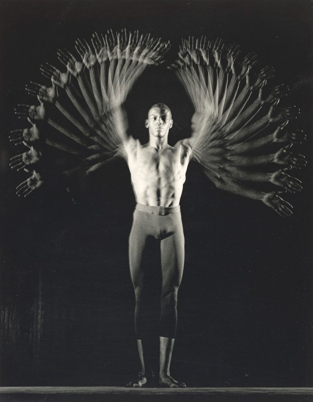 As a member of MIT's faculty, Edgerton continued to make photogenic studies, often with dramatic flair as evidenced by his attraction to speeding bullets, falling milk droplets, and hummingbirds stilled in flight. Capturing what was outside the capacity of the human eye endlessly engaged him and surprised others. In 1960, Edgerton became interested in recording the human body in dance. For this, he recruited the young MIT student Gus Solomons as his subject. The dancer, later a noted performer, believed in the uniqueness of his own movement, which he felt Edgerton's studies would prove. The results of these sessions are among the most poetic Edgerton made. Here, the moving arms of the lithe and strong Solomons are recorded as wing-like trails.