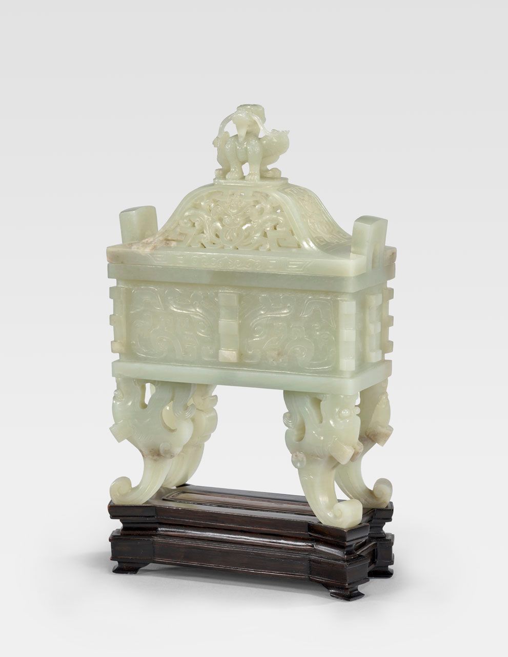 This elegant incense burner takes its form from Shang dynasty (circa 1600–1046 BCE) bronze rectangular food vessels known as fang ding. The “monster” (taotie) mask designs on the body, also based on earlier bronzes, show pairs of eyes, ears, horns, and a mouth bisected by a nose formed by a column of flanges. Stylized, open-mouthed dragons with curled tails make up the four feet. While the dragon is echoed on the lid, its more naturalistic depiction, together with the pierced lid’s flower-and-cloud shaped design, reflects more recent tastes of jade connoisseurs.