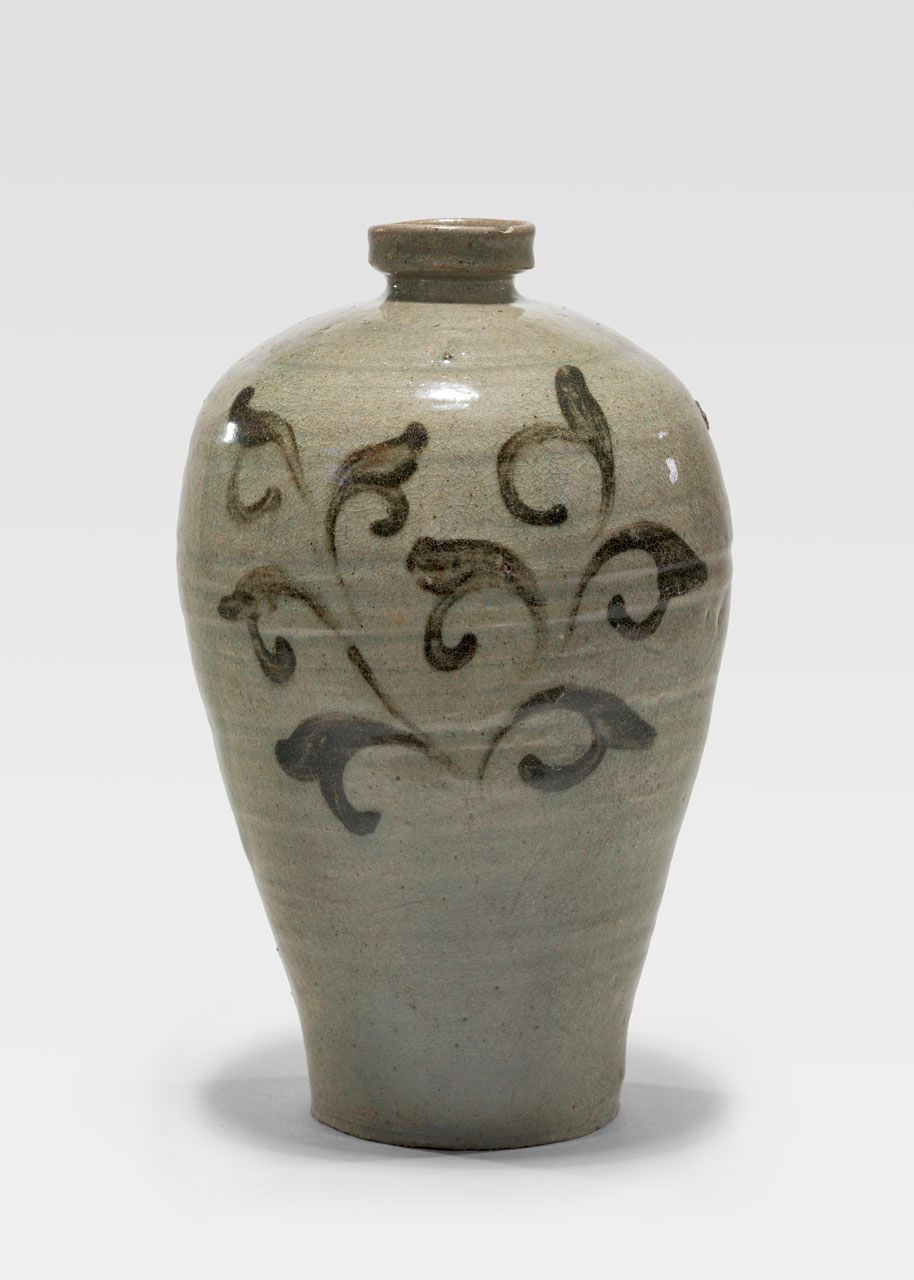 Title: "Jar" changed to "Jar with Leaf Scrolls Design". Description: updated to "13th century stoneware jar with underglaze iron-brown painted leaf scrolls design, gray-green crackle celadon glaze". Materials: added "stoneware". Updated by A. Chau, 2/28/2023.Note
