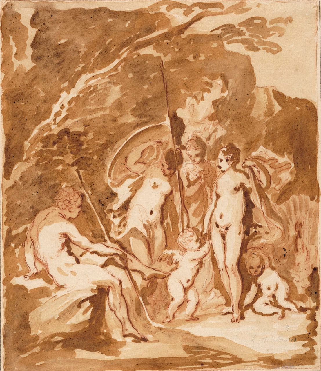 Red chalk, brush, and brown and pinkish-brown washes on cream laid paper