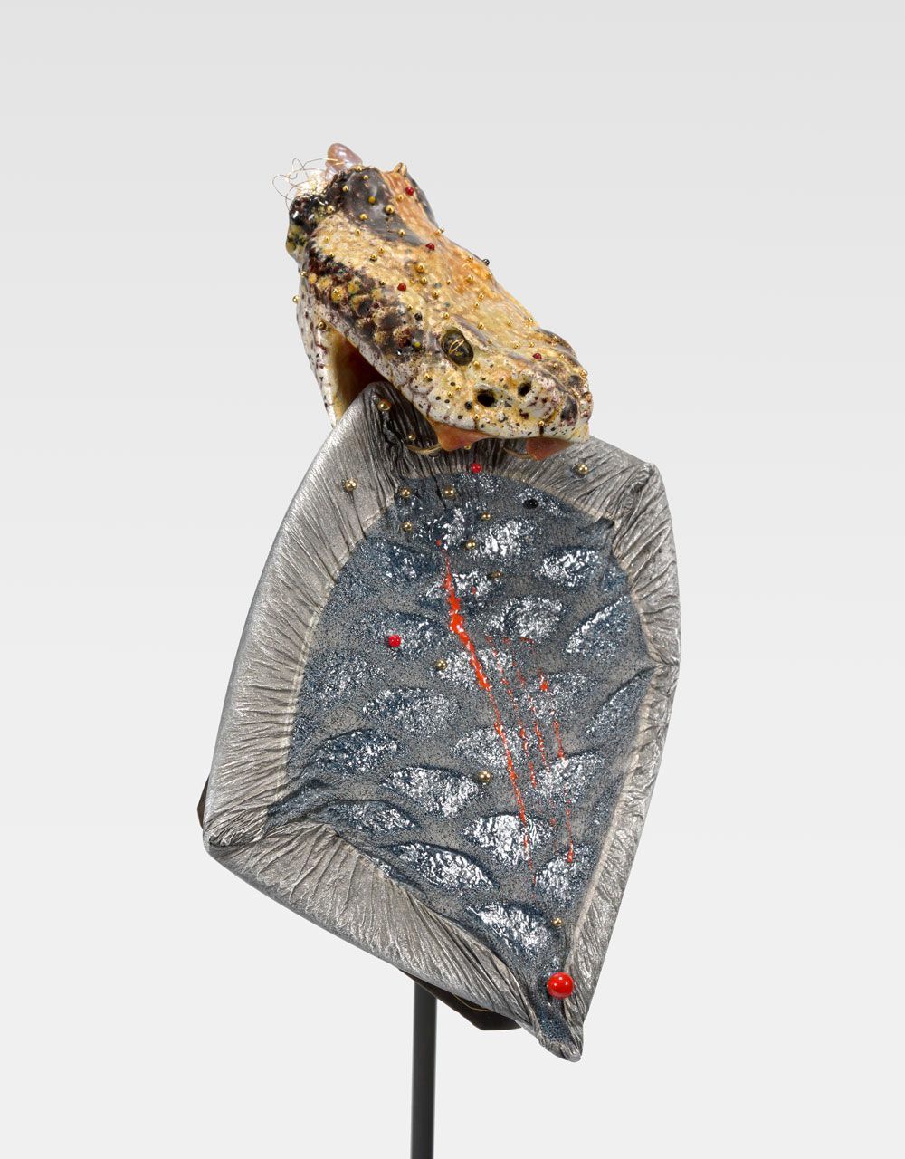 The snake depicted in Lucky Strike Brooch is a Timber Rattlesnake, the only species found in the northeastern United States. Freda first developed the idea of working with aluminum when he was living in upstate New York. During this period, he did a series of works combining aluminum panels and enamel. In this piece produced about ten years later in 2002, he particularly liked the way the aluminum melted and wrapped itself around the edges of the form. While this work is among the most menacing of Freda’s decorative brooches, the artist seems almost to revel in the beauty of the serpent’s head. As with the Sparrows necklace, Freda’s arresting jewelry, while grounded in a close observation of nature, is not for the faint of heart! The artist has stated, “I like the challenge of taking repulsive things and making them beautiful. When someone says ‘jewels’ to me, I think of frogs and snakes. I want people to see what I see.”