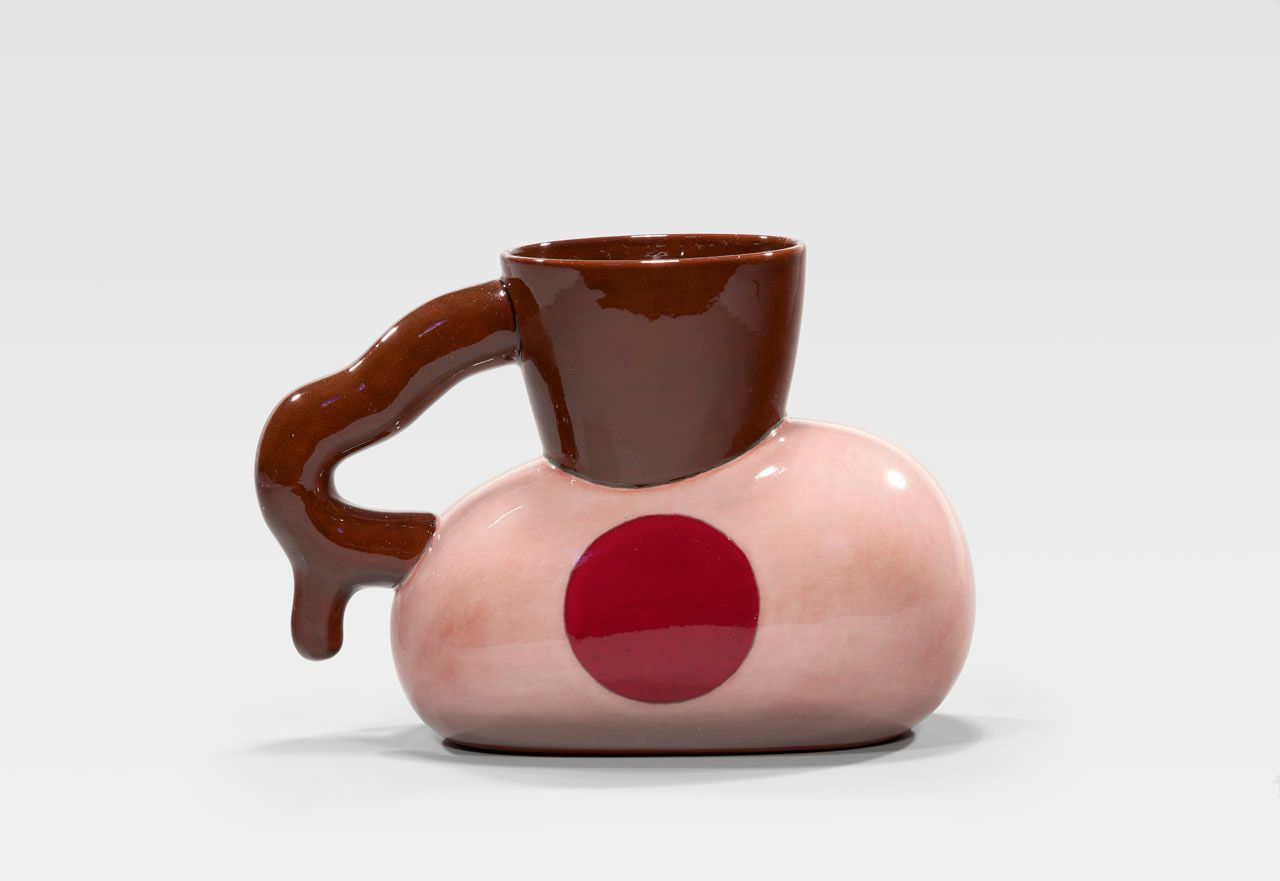 The cups were slip cast from a plaster mold. After the bisque-firing, each piece was hand-glazed with Duncan and Mayco glazes. Latex resist was used to mask off each color area during glazing. Each piece was glaze-fired twice at Cone 7. Glazes used were: MayCo 226 - olive green; Duncan 678 - cardinal red; Mayco 769 - peach and cream. The display box was designed by the artist and constructed from Red Birch, frosted glass, and clear glass.