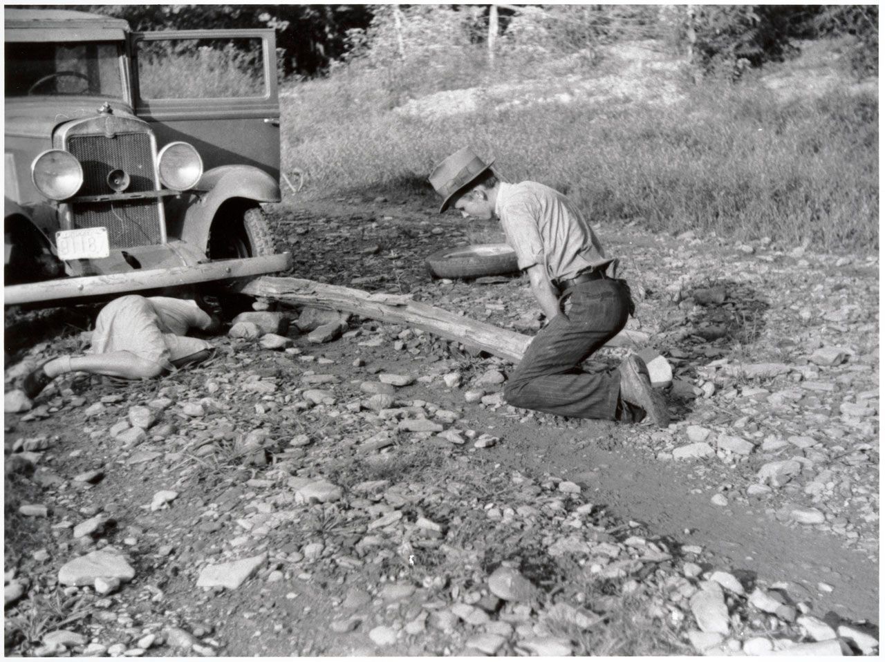 Mountaineer and Marion Post Wolcott changing a tire with a fence post as a jack, up South Fork of the Kentucky River, KentuckyEntry/Object ID