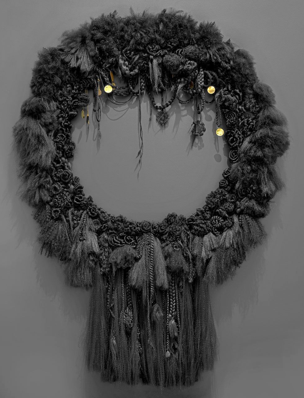SUBJECT: In Mourning Wreath, Hennessy gathers, coils, and braids human hair with synthetic hair sourced from Oakland beauty and wig shops. Hair has long been used in grief rituals across the world, from Nigeria and South Africa to Victorian England and the U.S. As the artist explains, “For black people specifically, hair is tangled with politics of race and hierarchies of power.” Hennessy’s wreath memorializes the collective trauma experienced by generations of Black individuals in the U.S.
