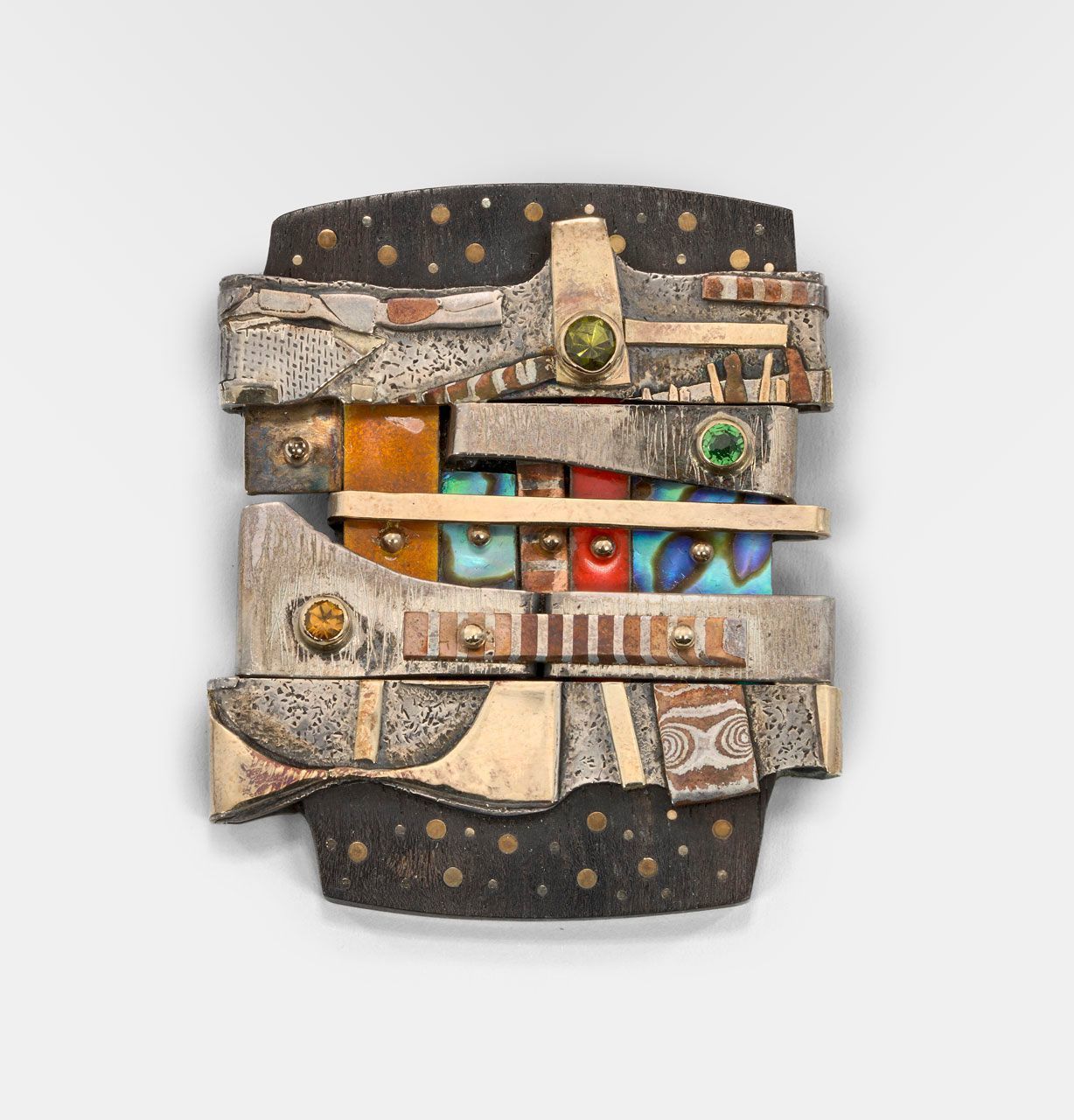 Ebony, enamel, mokume gane, sterling silver, 14k gold, and semi-precious stones