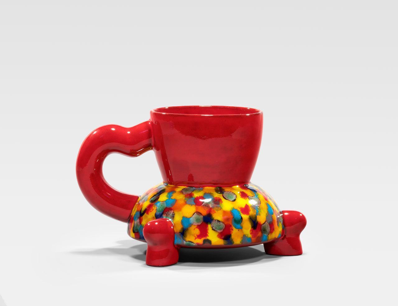 The cups were slip cast from a plaster mold. After the bisque-firing, each piece was hand-glazed with Duncan and Mayco