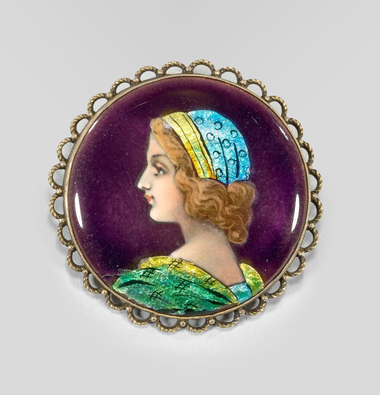 At first glance, it is easy to assume that this is a brooch made to mimic the late 19th century revival of Limoges-style figurative painting popular during the 15th and 16th centuries in France. The taste for such objects was prevalent at the turn of the 20th century. However, upon closer inspection, the stylistic differences become more apparent. Molli Juin did utilize the Limoges-style (painterly) technique to execute the image. The face is masterfully rendered in fleshy tones with attention to highlights and shadows. The dress and headscarf are executed in transparent enamels over silver foil. What distinguishes it from others is that the portrait appears to be of a person from the 1930s dressed in a fanciful outfit that is not epoque-specific. The deep aubergine background enhances the central image. The plaque is mounted in a gilt-silver setting that is typical of the Viennese style with which the artist was very familiar.
