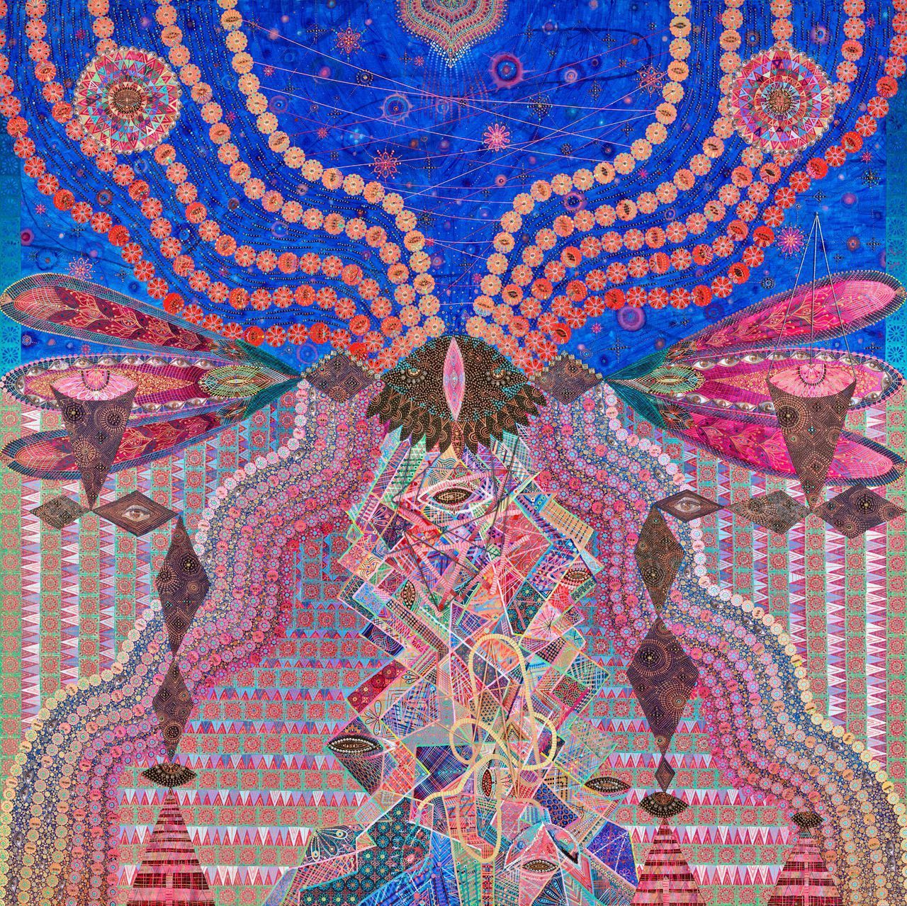 This piece is part of a body of abstract works I started making in 2018. I was inspired to make more universal and ephemeral pieces after an extended silent Buddhist meditation retreat I completed in 2018. They are constructed using a wide variety of small marks and materials combined together to form a larger cohesive structure in the same way that all life and material in known existence combines together to form the universe. Referencing imagery from the microscopic to the cosmic they are intended to show the interconnectedness of all beings.