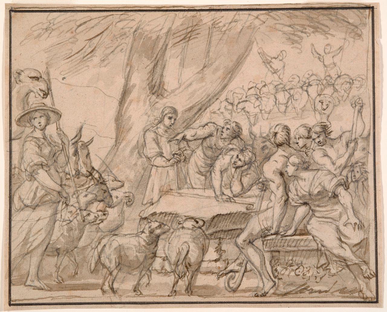 Pen and brown ink with brown wash, over black chalk on buff-colored paper