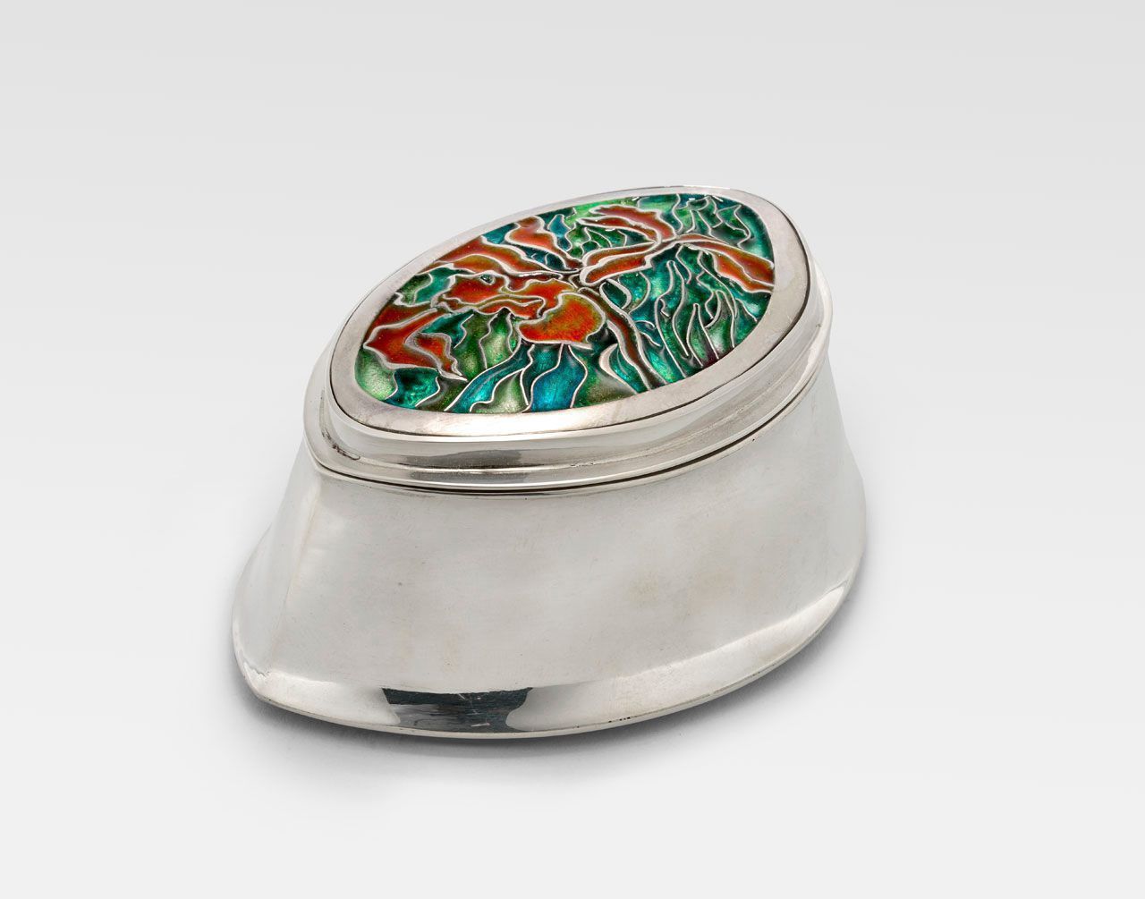 Maureen Banner described their process for making this box: “The lid with the enamel is fine silver fabricated by Michael by hand soldering a fine silver border onto the fine silver, a technique he learned at the Cleveland Institute of Art from John Paul Miller and Kenneth Bates. This is one of our earliest collaborative works and is one of our favorites. I cut most of the fine silver cloisonné elements and relished the challenge of making the red look red on fine silver.” Many of the floral images that appear in the Banners’ work such as the red irises seen here – were inspired by the flowers they grow in their own garden.
