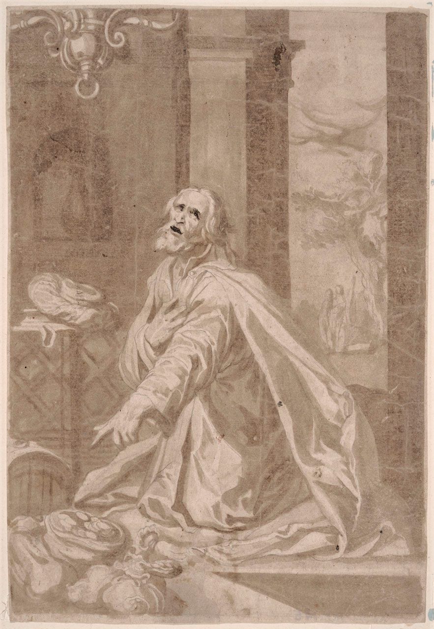 Brush and brown ink over a lead-point sketch with wash on tan paper