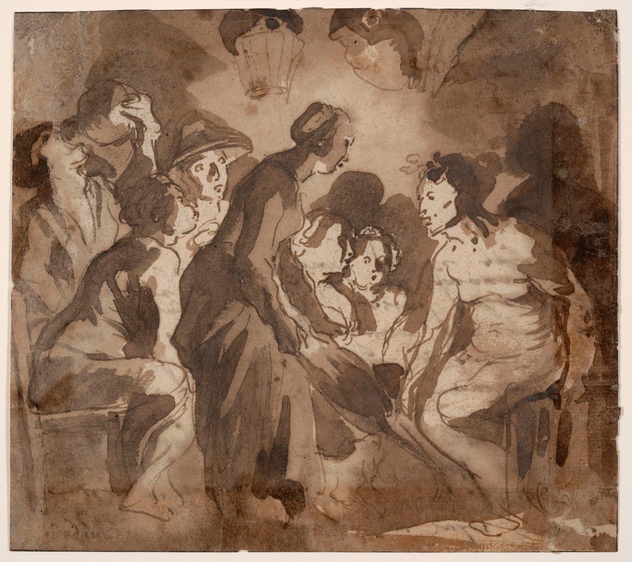 Pen and dark brown ink, and brush and brown washes,