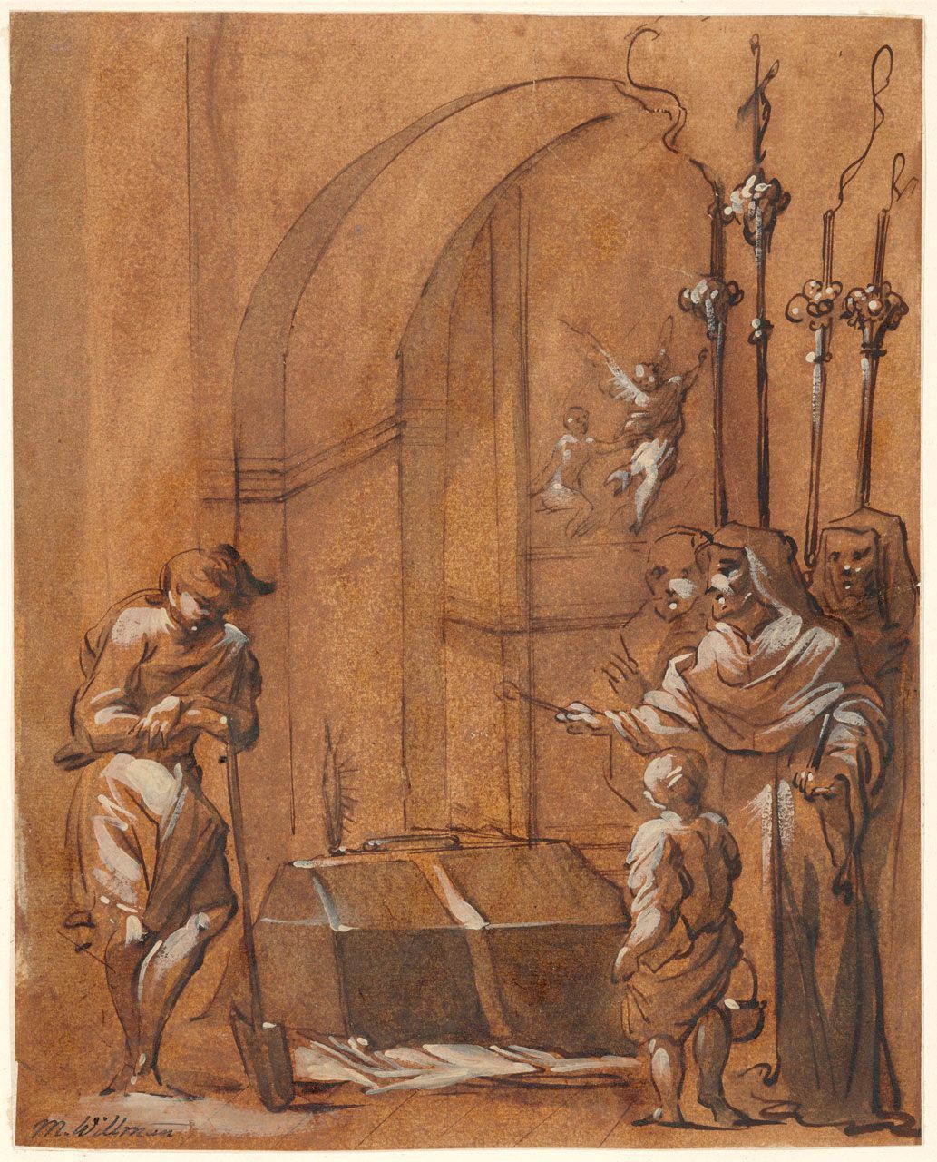 Pen and dark brown ink, gray washes and white heightening on ochre-colored paper,