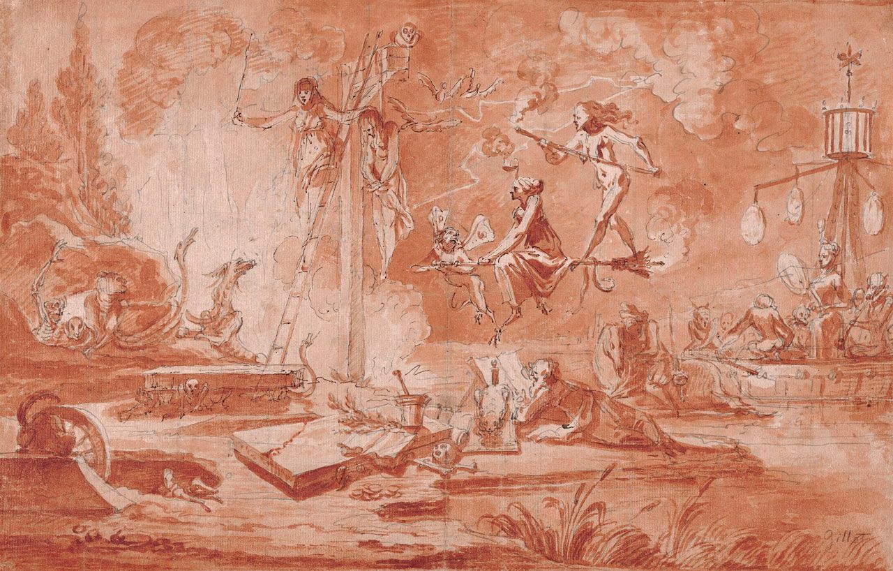 Pen, black and dark grey ink, and brush and red washes on cream laid paper