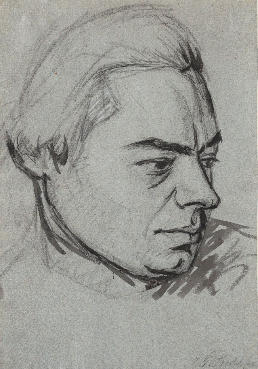 Black chalk, brush and black ink and grey washes, touches of white chalk on blue laid paper