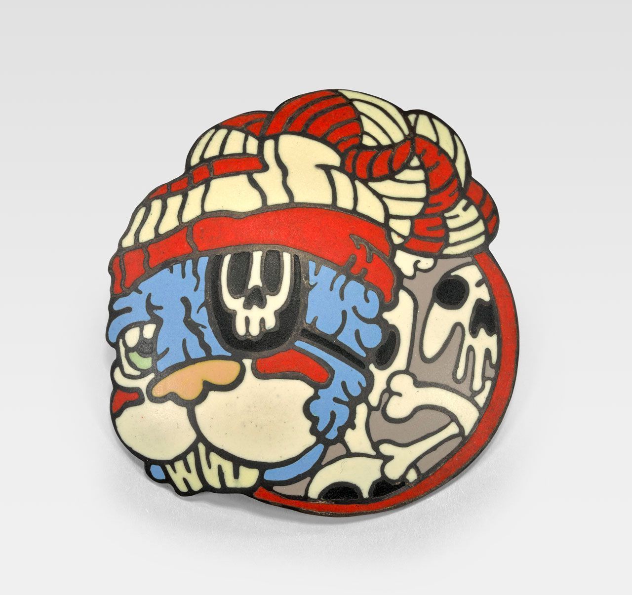 Another autobiographical piece, Set Sail/Find Home Brooch reflects some of the artist’s mixed feelings about returning to his parents’ home in Quincy, Illinois after completing graduate school. With its image of pirate, wearing a skull-covered eye patch and cap, this unusually large brooch embodies Lechtenberg’s fears and disappointments. However, in spite of the self-deprecating “YB Sucks” on the reverse, the inscription “Set Sail/Find Home and What It Means” underscores Lechtenberg’s determination to remain hopeful, push forward, and keep moving ahead.