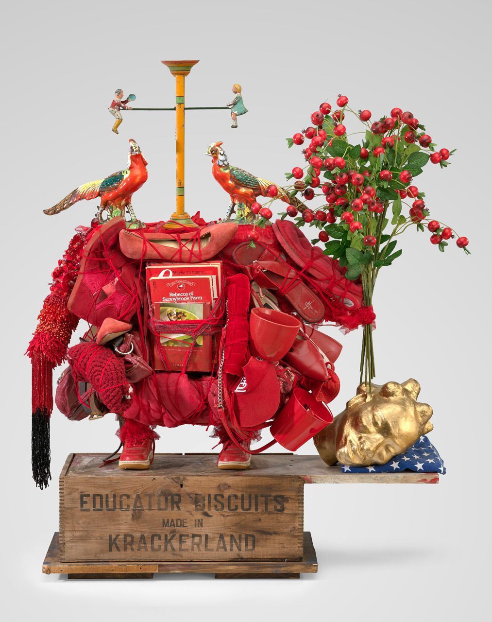 The box: Educator Biscuits made in Krackerland, red, red, red, red, red, red, red, rage, red books, red shoes, red purses, red hats, red beads, rage, spit, hustle, grit, plaster, hair grease, rest after years of swallowing cruelty that you promised was, “in my best interest”, a petty bitch, old tin toy time keeper, two old birds—ceramic and mostly red, wood, a fire in my heart, gold, american flag inspired Fourth of July purse, cuz why not, rage, refusal to be your negro tour guide, rest, silk and plastic flowers, red belts, red yarn, plaster guaze, black pigment, red glass beaded trim, red baby Nikes, ptsd, ridicule, desperation, red, hot, heat, fire, burning, a little riot on a box.