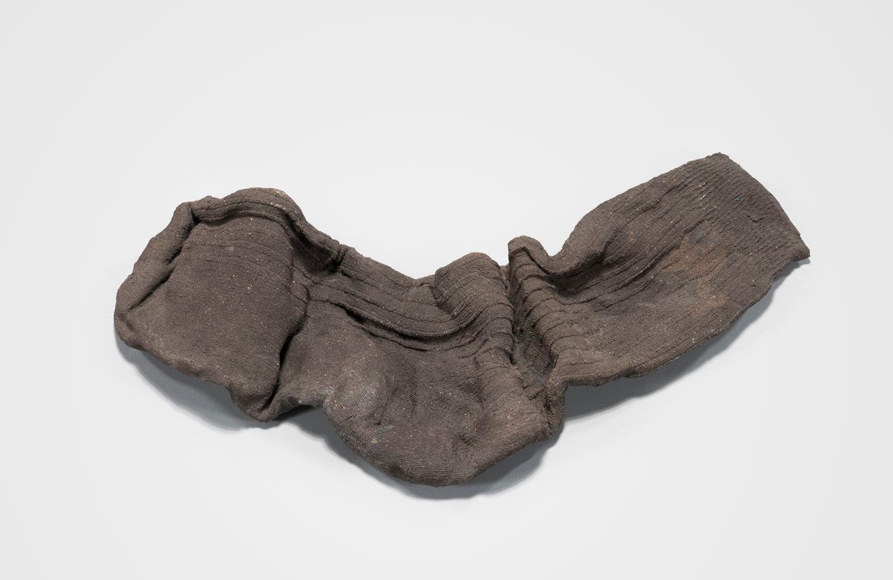 All gifts to me from the artist at the time work was created. The sock was made during her student days at UCB, probably about 1969 when she first discovered the magic of making clay look like fabric and leather. The glove was a bit later, maybe late 1969 or early 1970 as she was perfecting her technical skills. The shoe was included in one of her first exhibitions at Hanson Fuller in SF