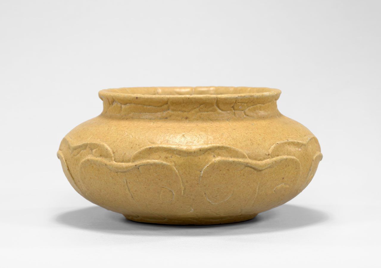 Squat Vase with Matte Yellow Glaze Decorated with Overlapping Leaves