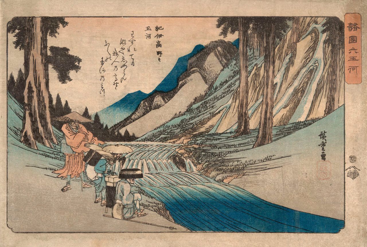 Title changed from "Pilgrim by Flowing River" to "The Koya Jewel River in Kii Province", based on the printed title at the center top. Description also updated. Updated by A. Chau, 12/14/2023.