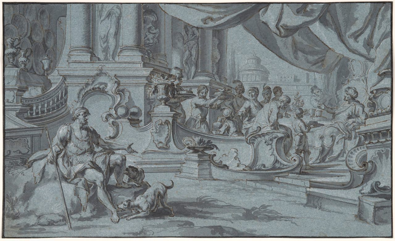 Black ink, brush and gray washes and white opaque watercolor on cream laid paper
