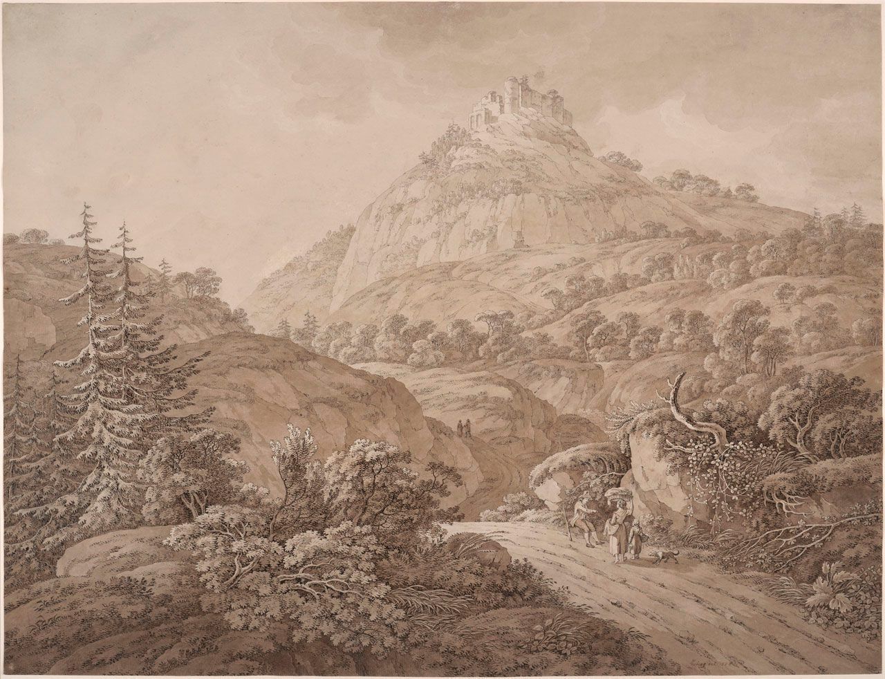 Pen and black ink, brush and brown wash on cream laid paper,