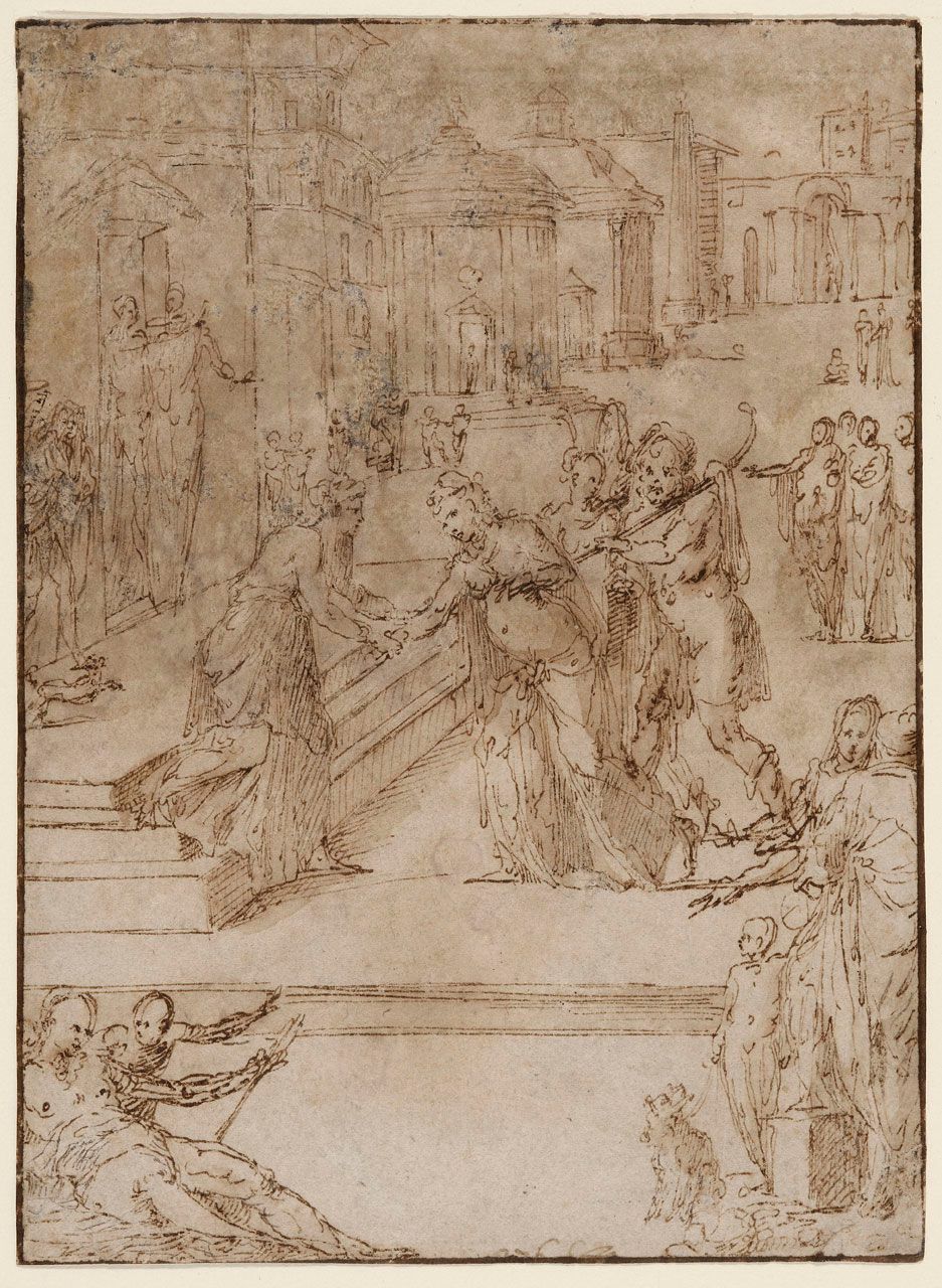 Pen and dark brown ink, and brush and brown wash on buff laid paper