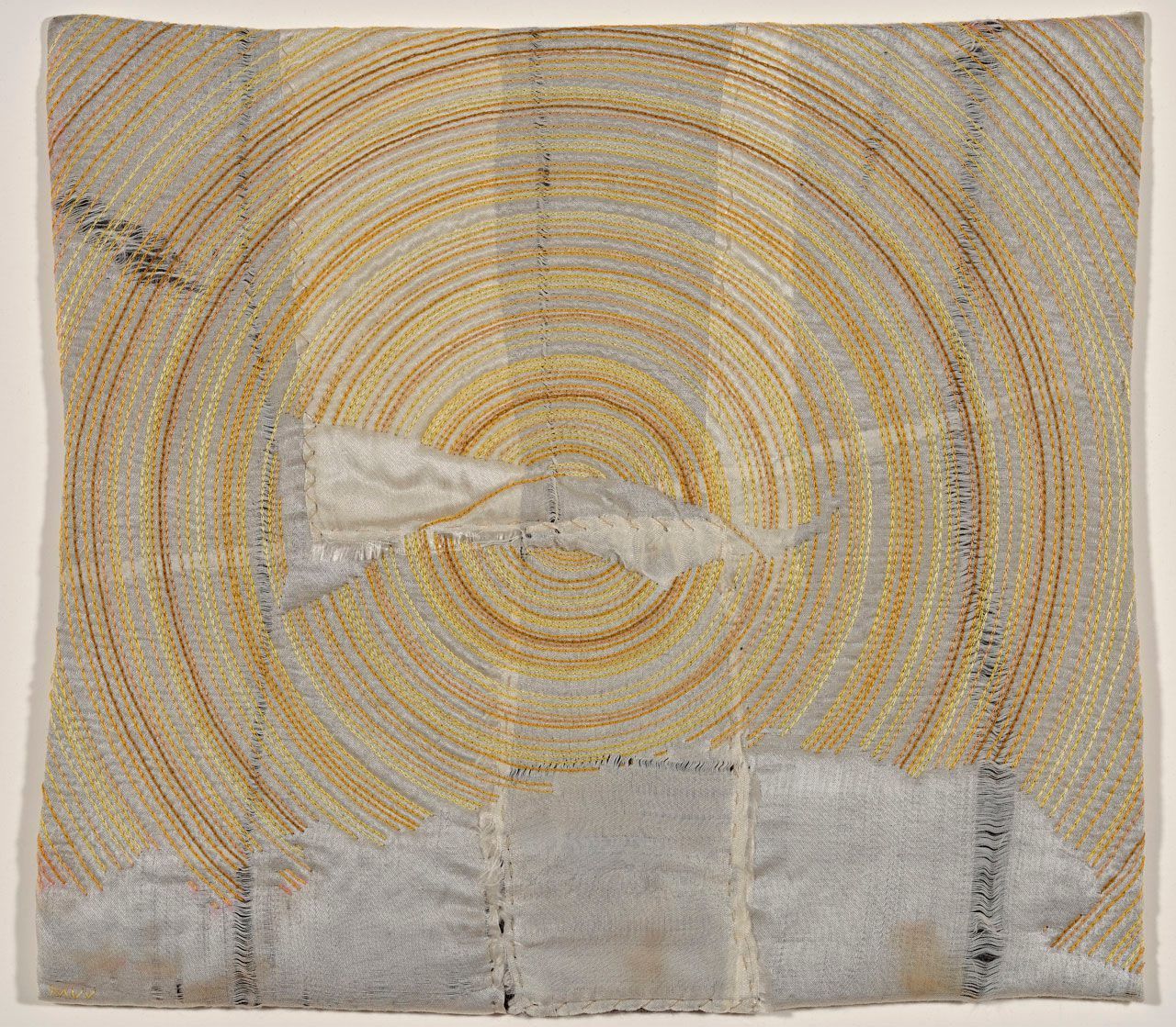 Reclaimed wool blanket, satin binding, thread, and embroidery floss