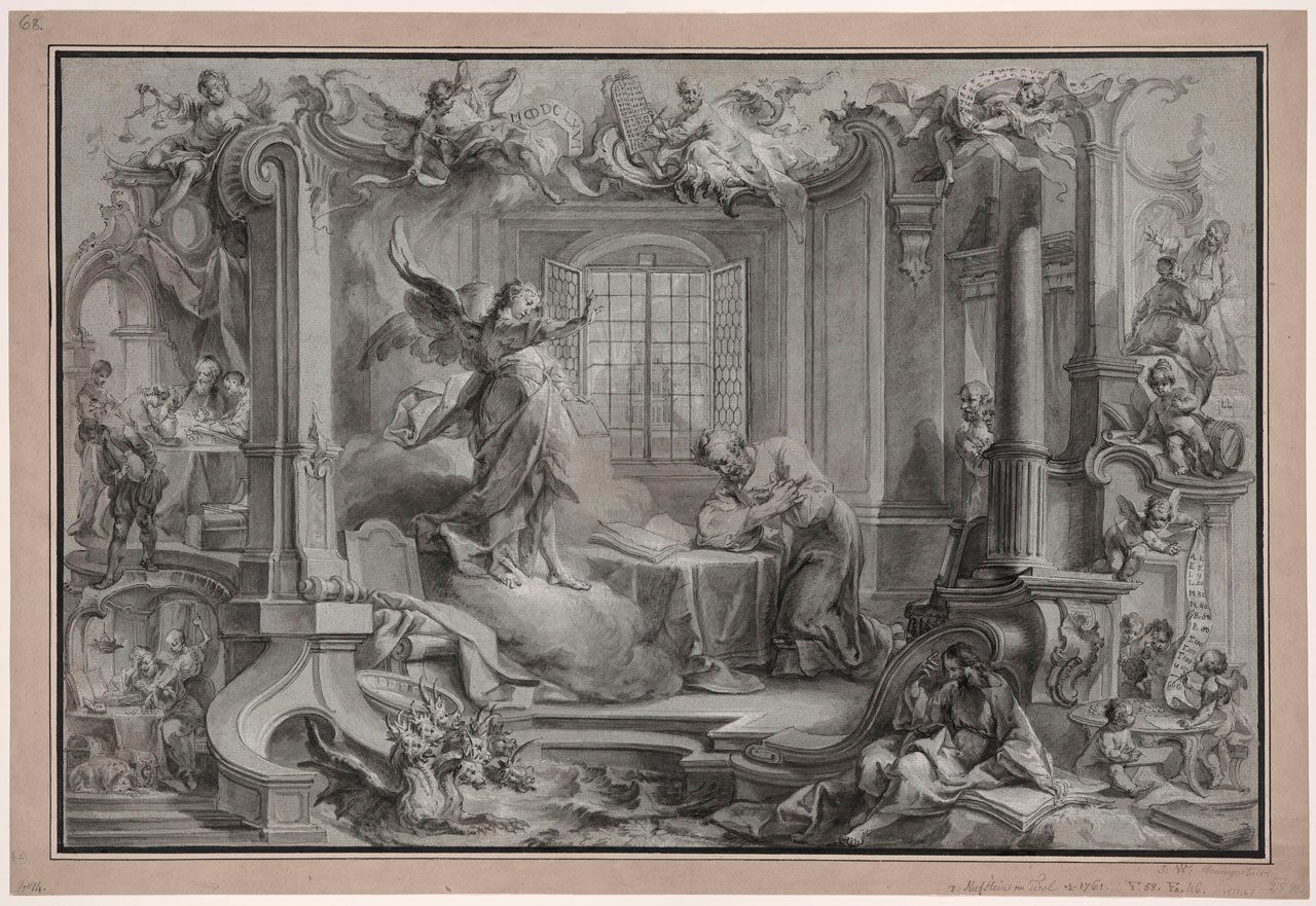 faded blue-green paper, scored for transfer, Pen and brush with black ink, grey wash, white body color, over graphite or black chalk, underdrawing on faded blue-green paper, scored for transfer, Pen and brush with black ink, grey wash, white body color, over graphite or black chalk, underdrawing