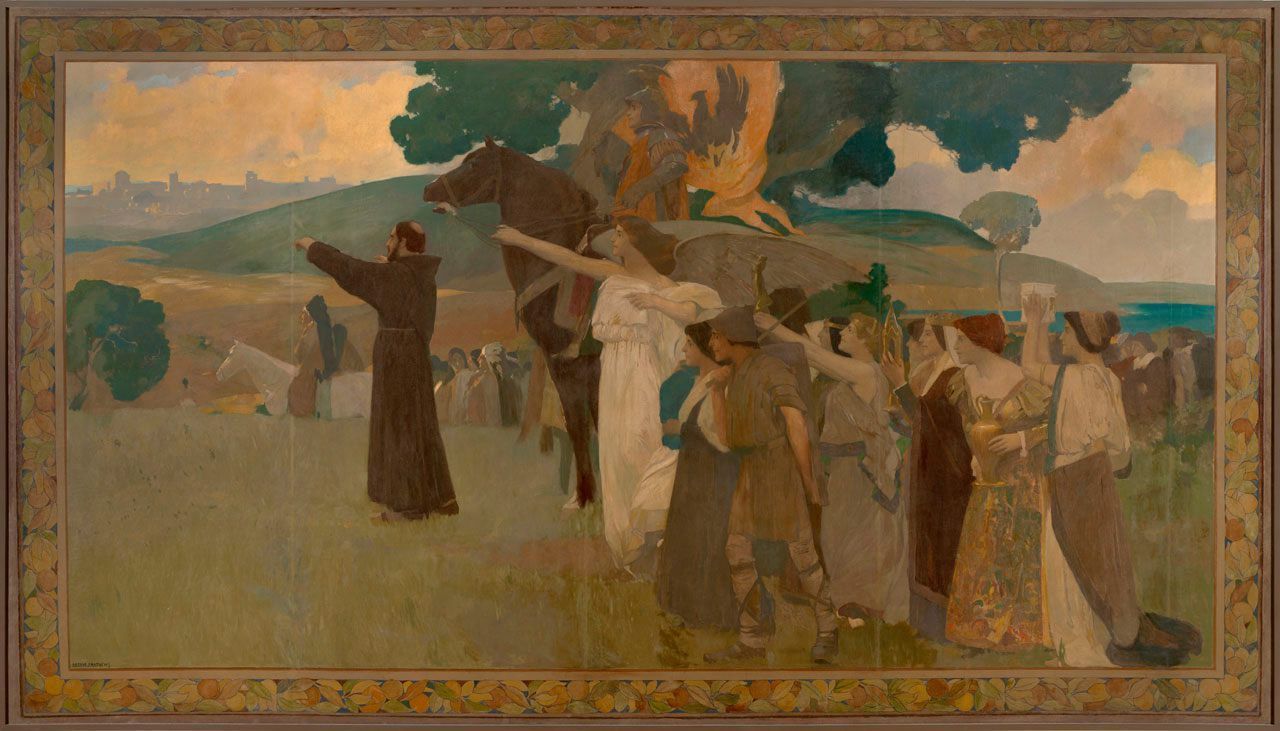 The painting, 'St. Francis,' would seem to be an artistic interpretation of, "Westward, the course of empire takes its march." In the foreground appears the great concourse of the ages; here a puritan of simple habiliments, there a courtier of a gone by day, here an Indian aborigine, there a knight in quest of glory, while leading them all is the brown clad figure of the great Saint, his arms uplifted toward distant goal, the promised, city beautiful.