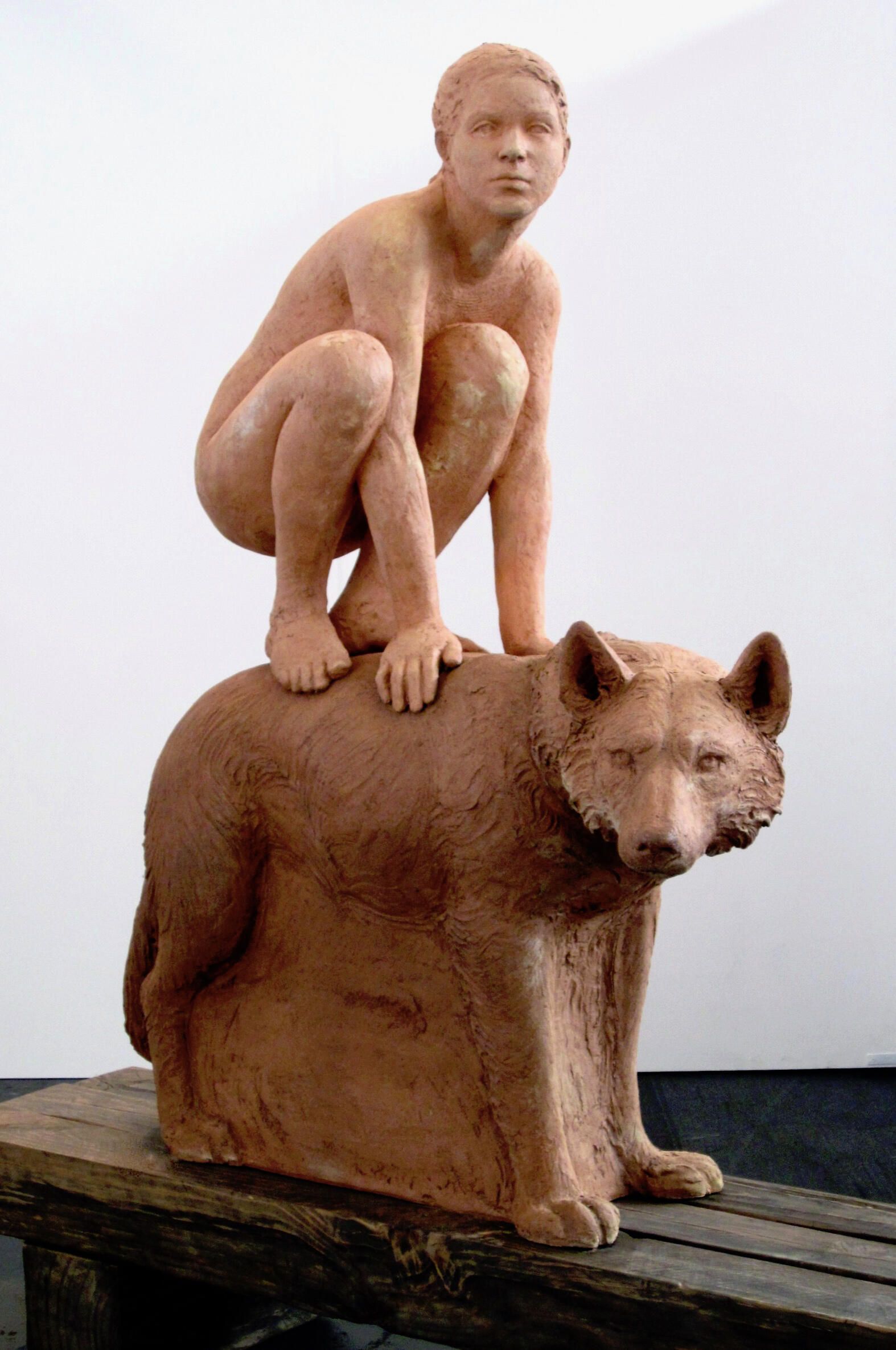 Ceramic, red sculpture mix fired at cone 2 reduction, wood bench