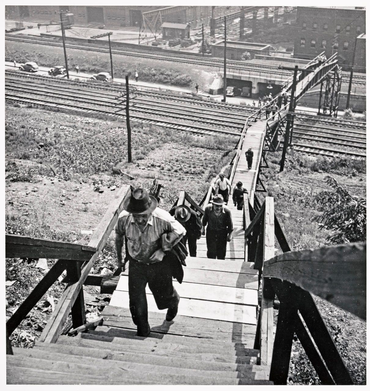 Instructed to document how Americans work, Post Wolcott visited Pittsburgh’s steel mills, then the backbone of industry. In this photograph she uses an elevated position to observe the millworkers on their heroic climb home. By working rapidly and traveling constantly throughout 1939, Post Wolcott gained a sophisticated sense of timing and composition that are evident in this image with its daring perspective and formal juxtapositions. In 1941, she married Lee Wolcott and ultimately settled in California.