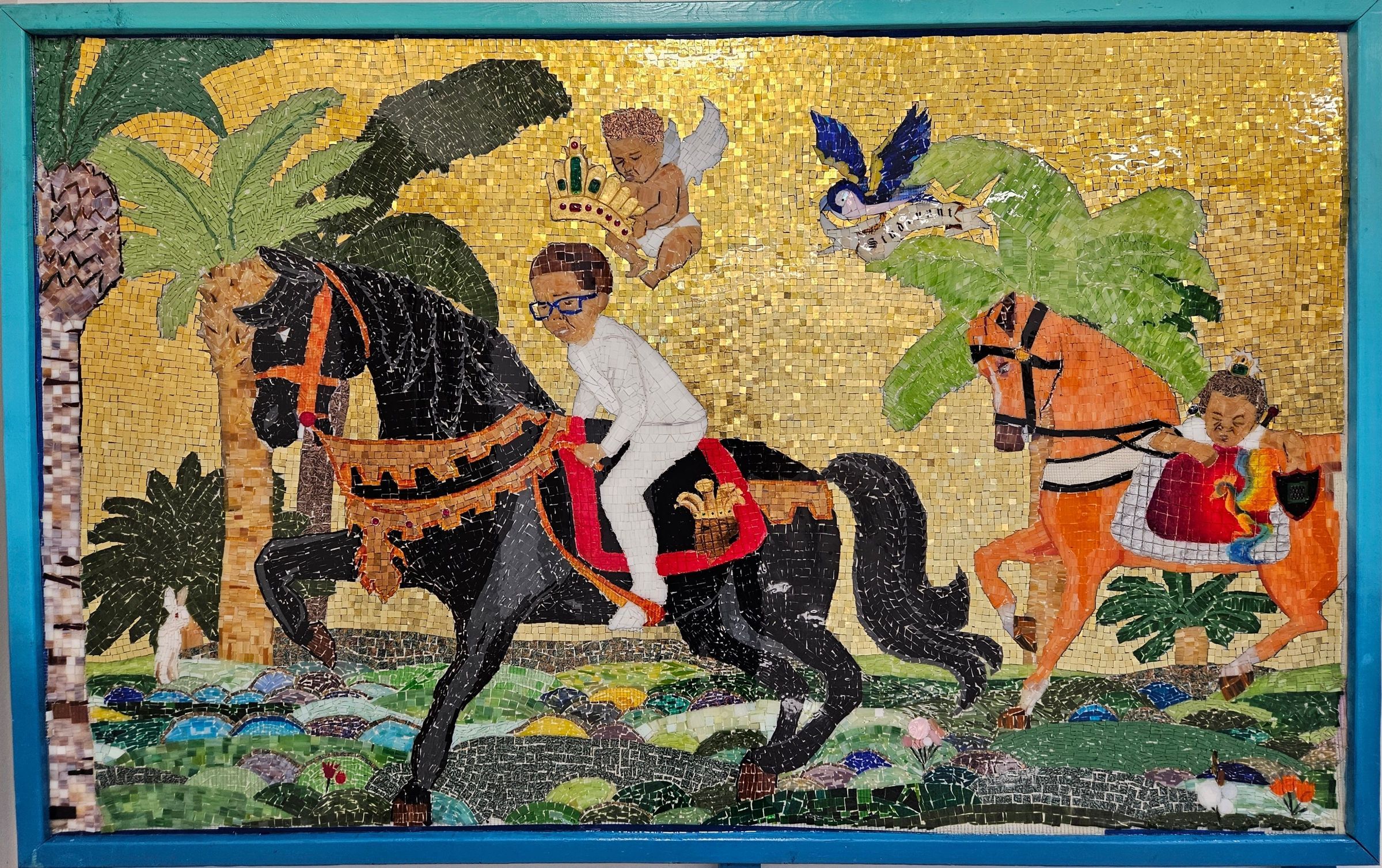 A glass mosaic of two children on horseback. The left child is seen riding a black horse and is being crowned by a cherub figure. Following after the cherub is a blue bird holding a sash with the word "Studivant" on it. The right child seems to be seen in mid-mount on a light brown horse. Palm trees are positioned to the left and right of the scene. The horses walk above a colorful path and in front of an expansive golden background.Made/Created