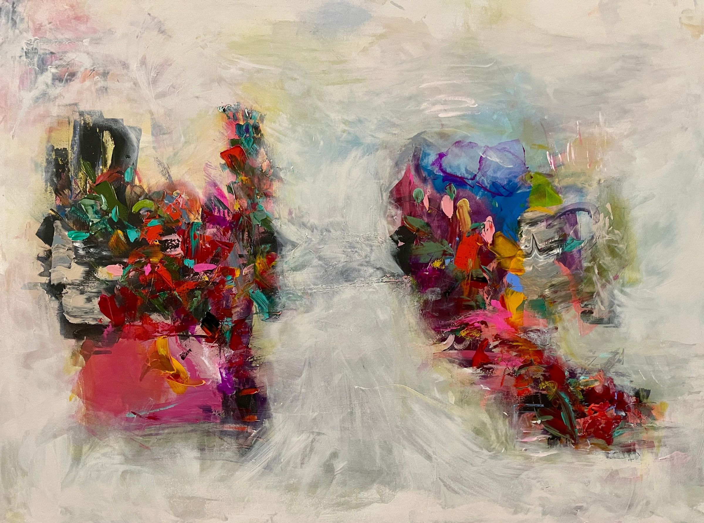 Abstract landscape of warm and cool colors in front of a white background.Made/Created