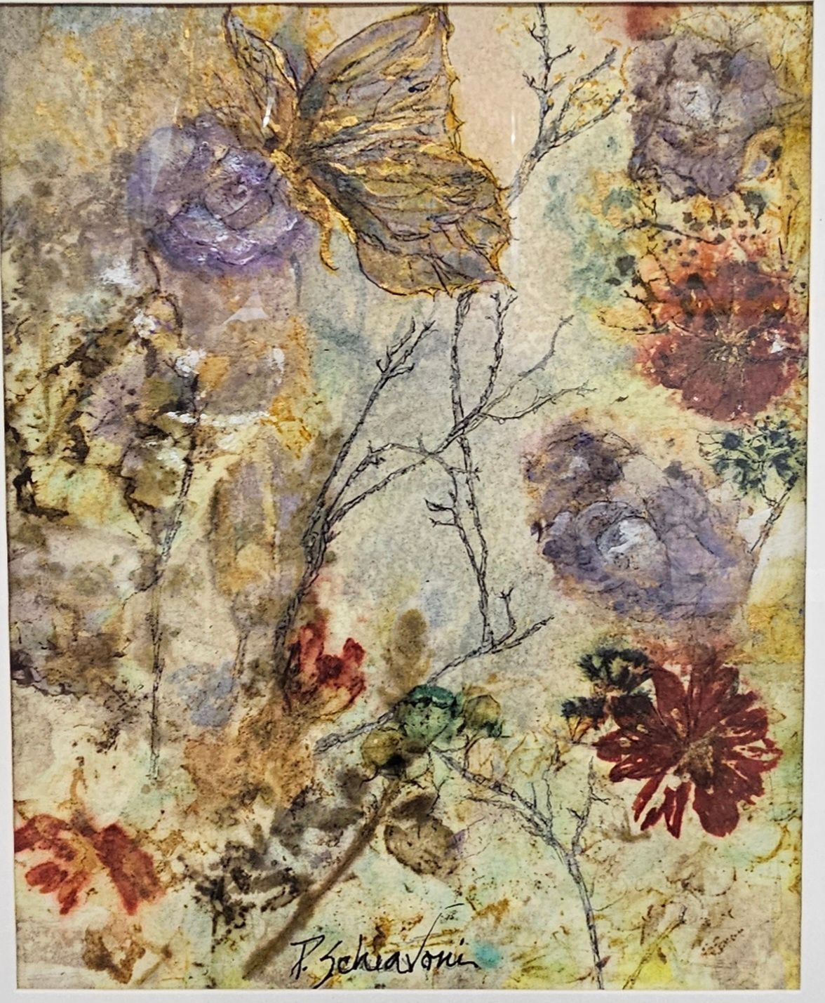 Abstract scene with colorful flora and a golden butterfly.Artwork Details