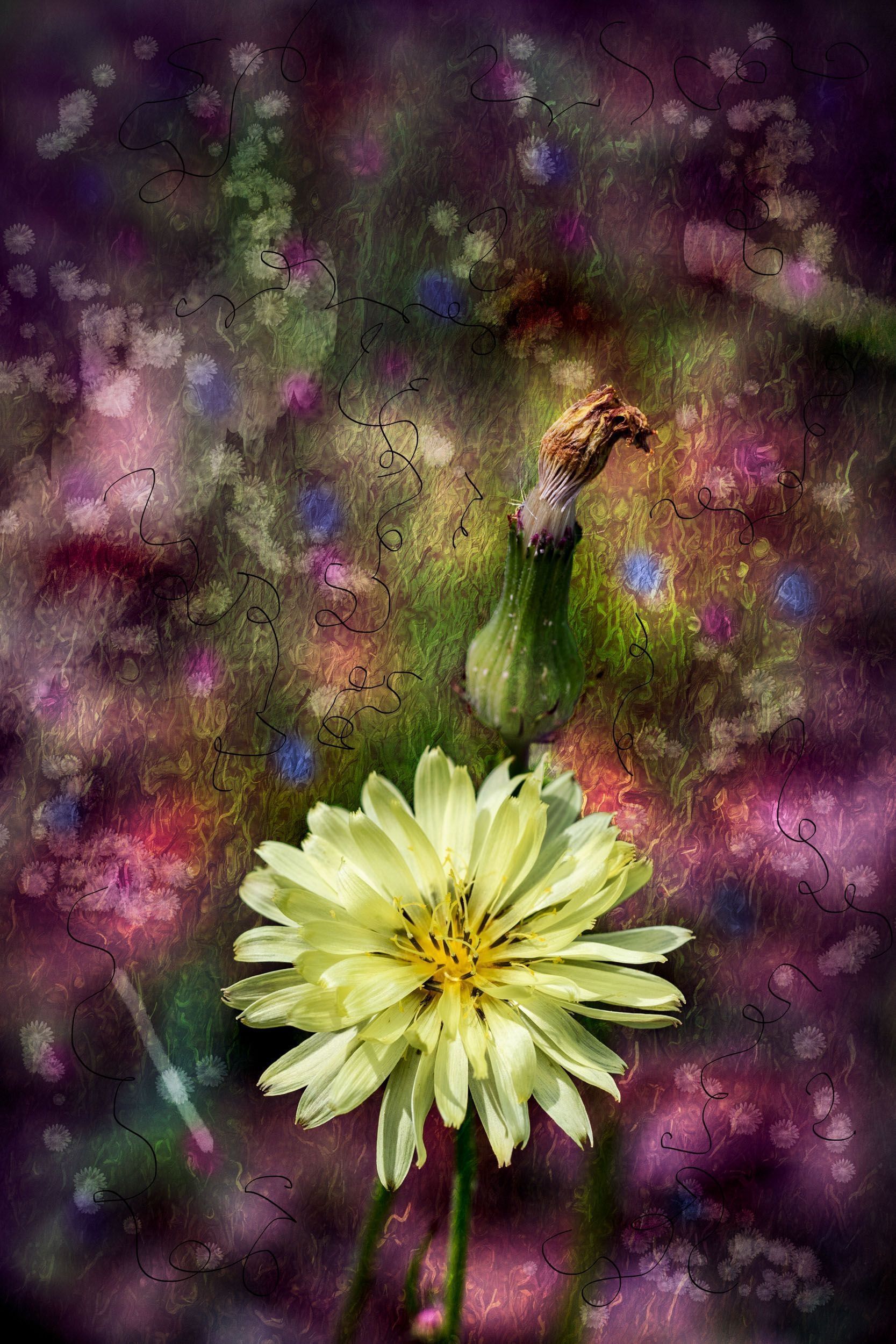 Abstract landscape of dandelions and a dandelion bulb.Photograph Details