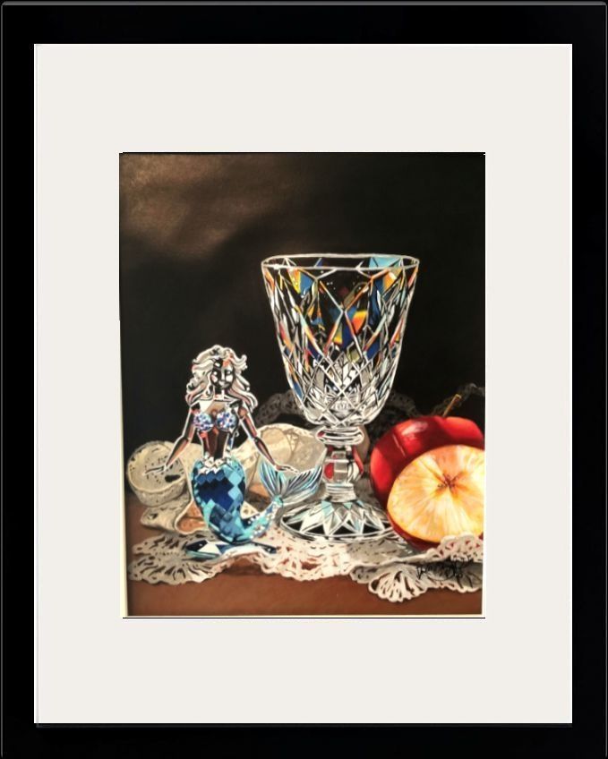 Still life of a glass mermaid figurine, glass cup, and Asian pears. The cross-section of one pear is shown in the foreground.Made/Created