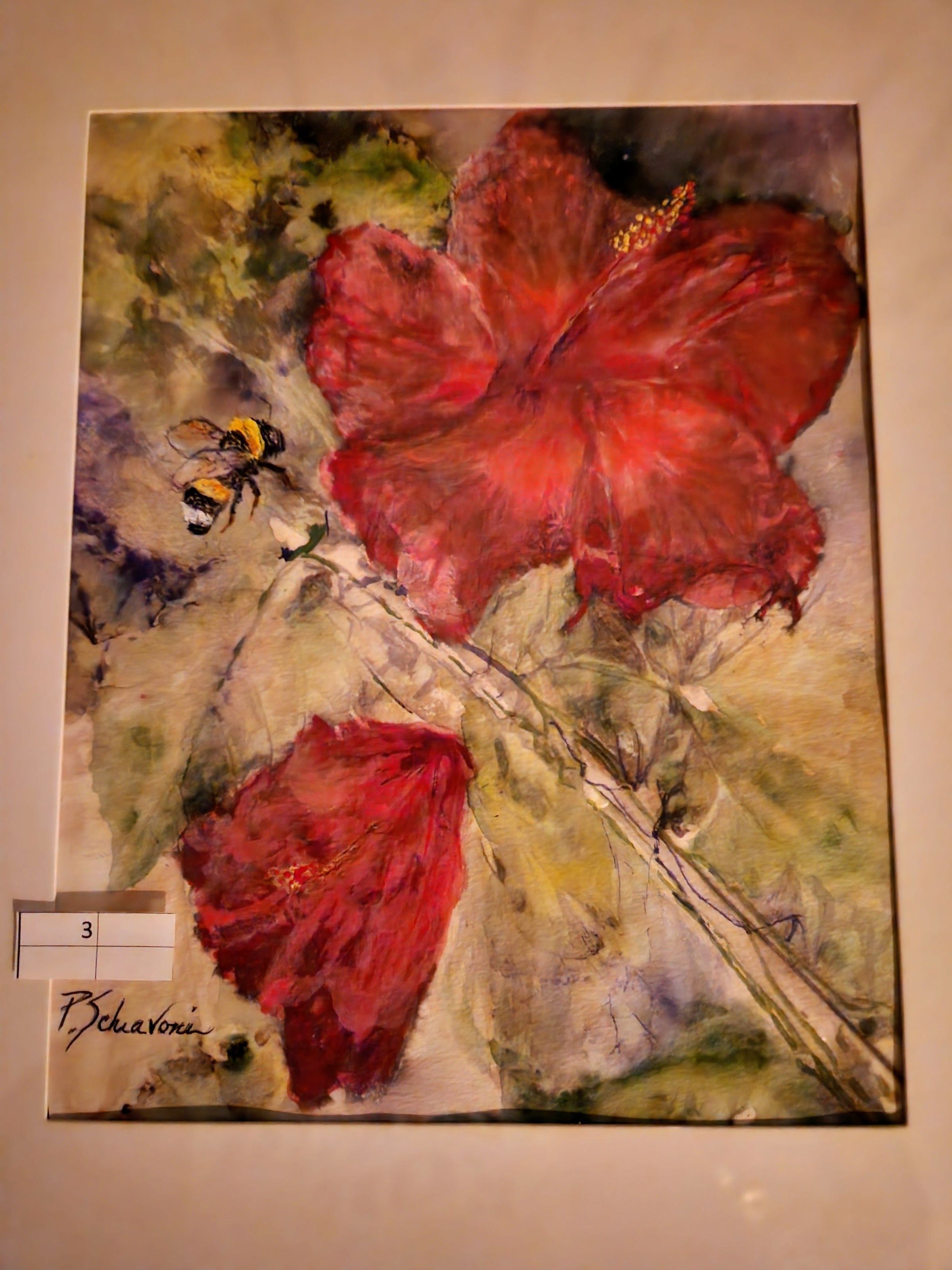 Abstract scene of a bumblebee, red hibiscus, and other botanicals.Artwork Details