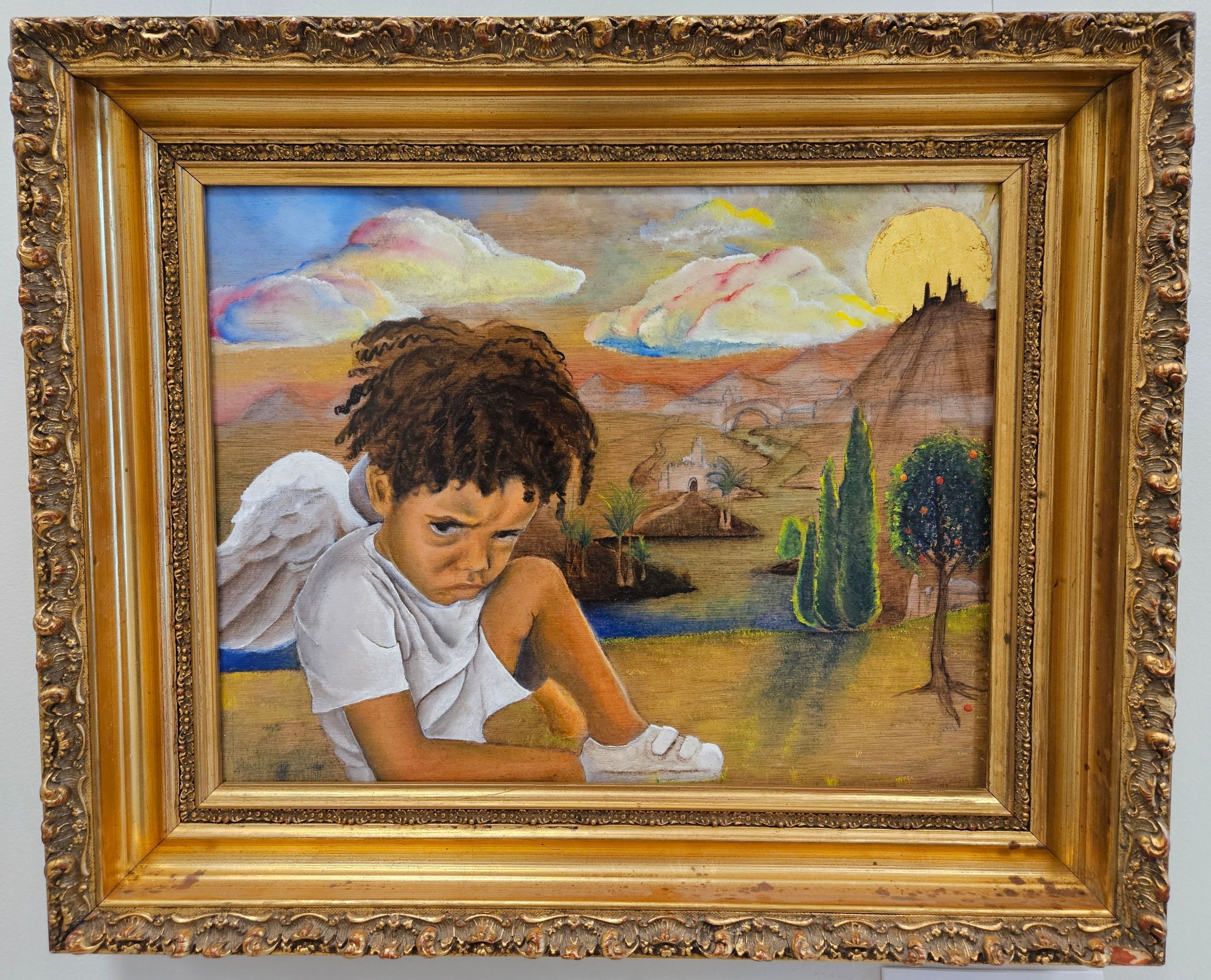 A winged-child broods in the foreground. Behind the child is a river that leads back into a fantastical kingdom and a setting sun.Made/Created